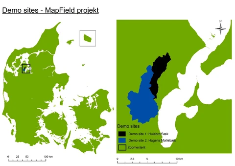 I MapField indgår både validerings- og demonstrationsområder. I valideringsområderne tester vi de udviklede metoder i MapField mod lange tidsserier af måledata. I demonstrationsområderne viser vi potentialet med MapField metoderne i forhold til at udvælge og placere virkemidler (som fx efterafgrøder, minivådområder mv.) optimalt i landskabet som skal reducere N i vandmiljøet.
